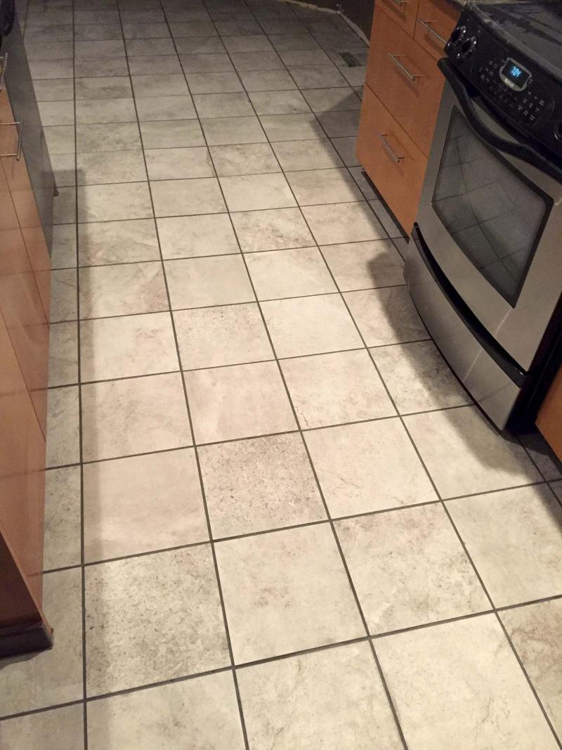 Once the coil for the heated flooring was set into place, I installed the tiling throughout the kitchen adjacent to the existing hardwood, at the cut-line.