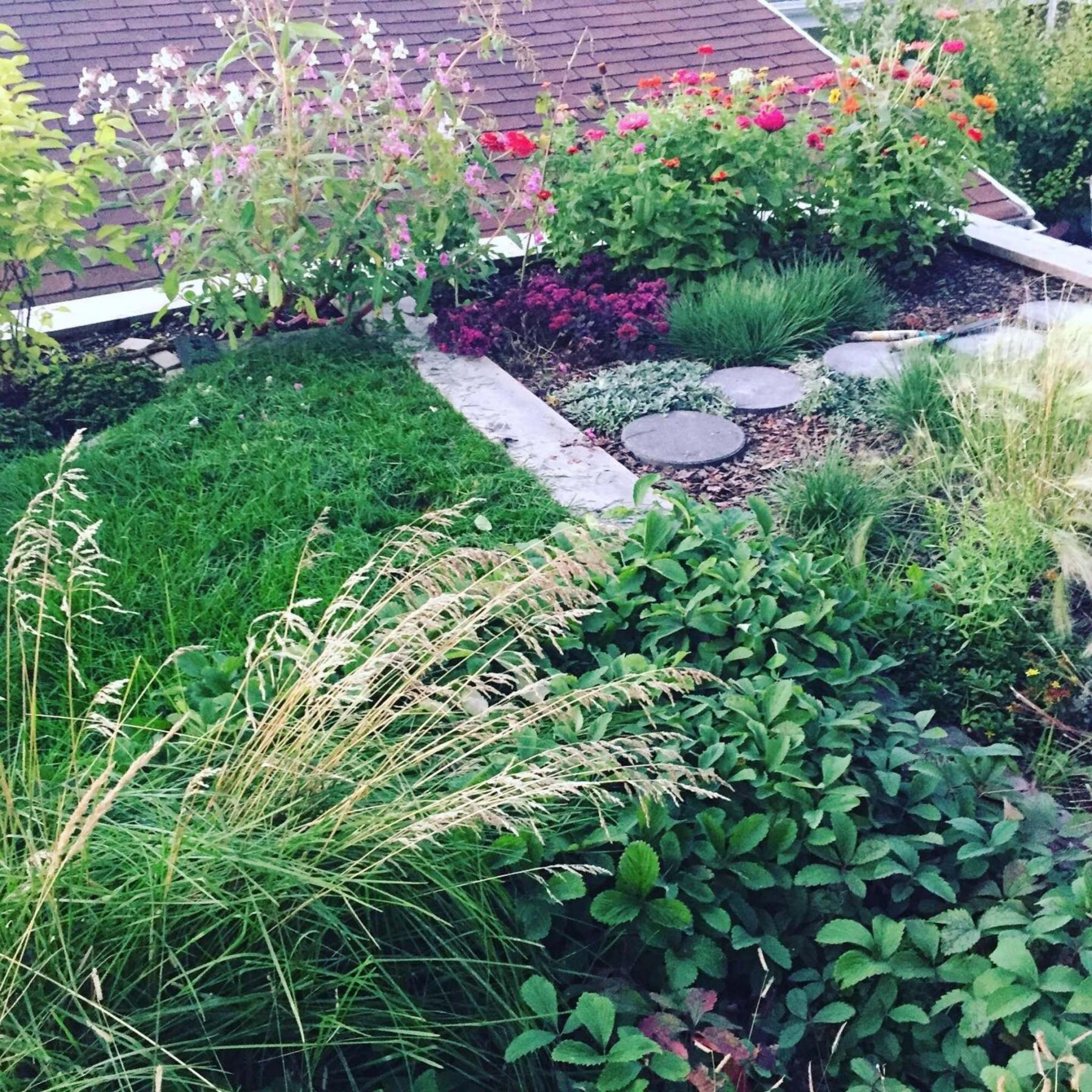 Above the waterproofing membrane on Klassen’s green roof, there is 3.8 cm of gravel topped by a layer of landscape fabric and then a 15 to 17 cm layer of soil mix which is a combination of bark, topsoil and peat moss. After a truck with a conveyor belt elevated the soil (12 yards in all) and gravel to the rooftop, Klassen immediately started planting and designing his rooftop garden. Now in its fourth year, Klassen’s rooftop garden is a small-space marvel complete with a water feature, stepping stones, a small grassy area with room enough to relax in a chair or in a comfortable, stretched out position for stargazing, and above all, a plant palette filled with textures and colour.