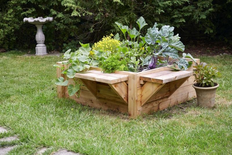 Add benches to your raised-bed garden to make planting and weeding easier.