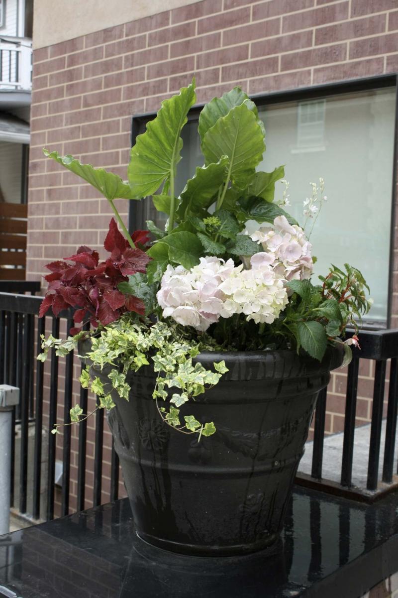Every container design needs a focal point. This creamy pink hydrangea paired with Alocasia California, a chartreuse elephant ear, steals the show.