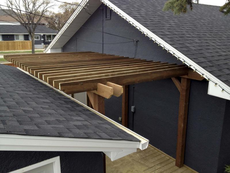 By lining up the veins upside down on the ground, and side by side, precise measurements for the notches were first marked. Using a circular saw, eight cuts (two cuts just over four cm apart in the four locations) were achieved. Using a mallet, the wood between the pairs of cuts was knocked out, rendering the required notches, 76 in all. The veins were placed onto the main support beams one by one, with the flat end against the wall of the house and the overhang above the roofline of the garage. The veins were then fastened to the main support beams, at each notch location. To prevent the pergola from swaying on the unsecured side along the garage, four-by-four braces were affixed to the six-by-six posts and support beams, at a 45-degree angle, also esthetically pleasing.