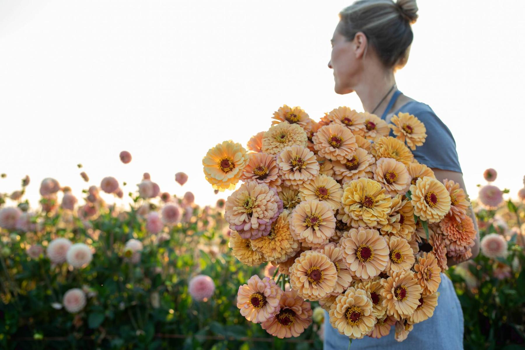 Erin Benzakein with Zinnia Golden Hour, a new large-flowered Floret Originals seed variety bred and developed at Floret Flowers.