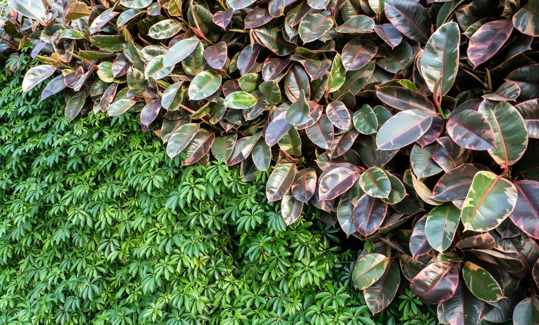 Schefflera umbrella plant and Ficus ‘Ruby’ rubber plant are two of the plant species in the 25 metre long green wall at The Leaf.