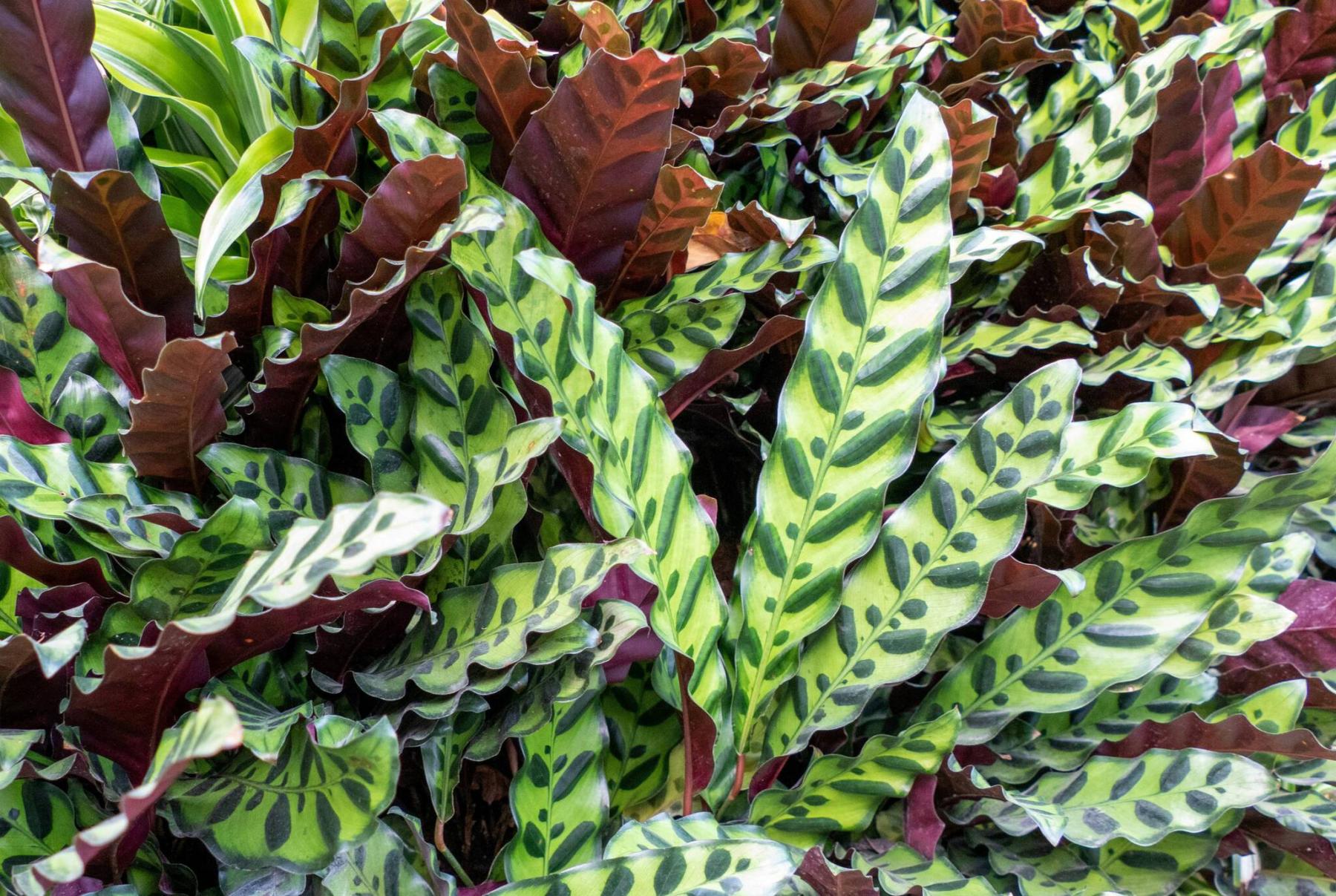Calathea, also known as the prayer plant, features a unique brushstroke pattern and purple undersides.
