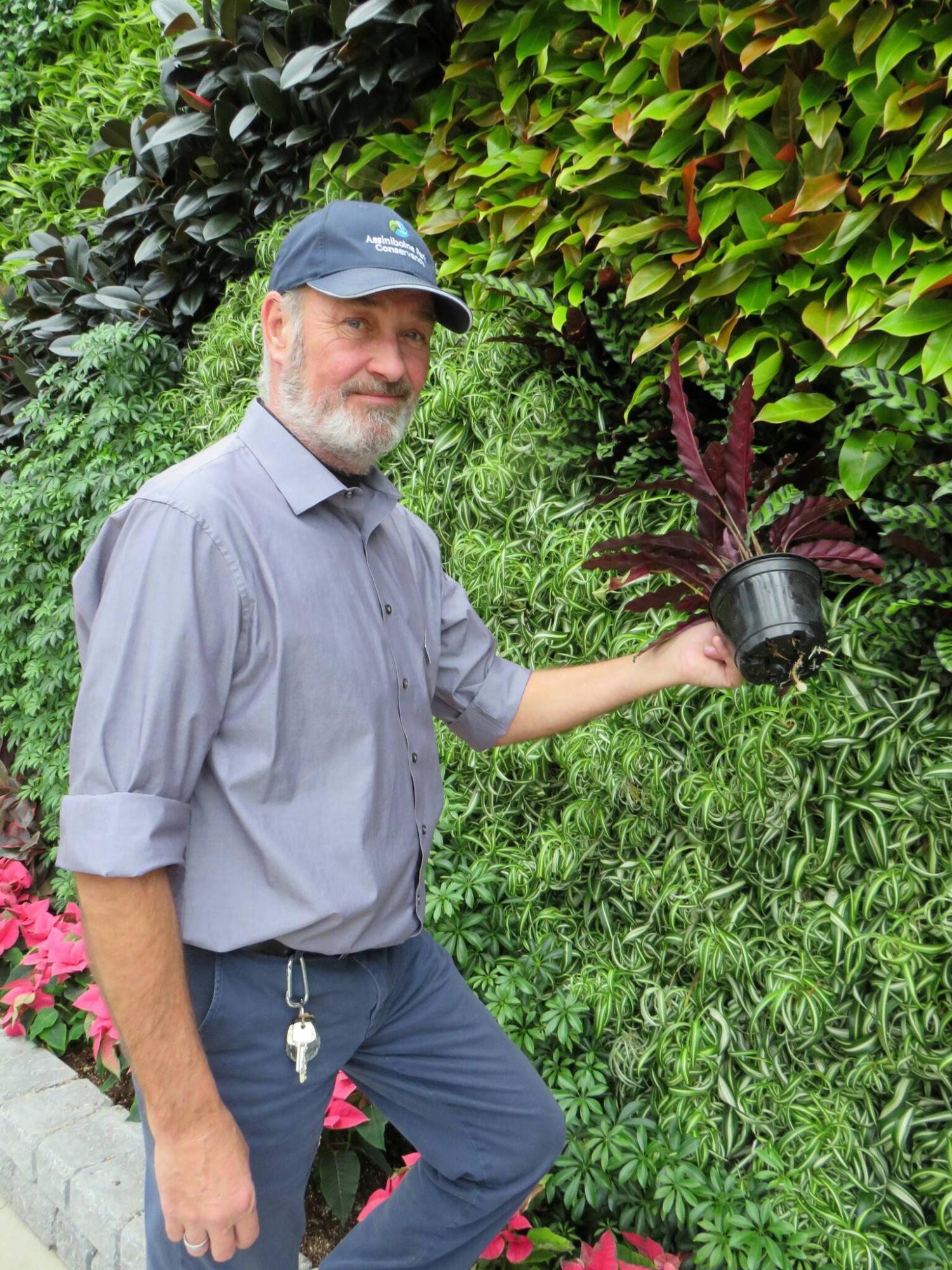 Wade Meisner, curator of horticulture, Assiniboine Park Conservancy, shows off one of the green wall’s 4,400 potted plants.