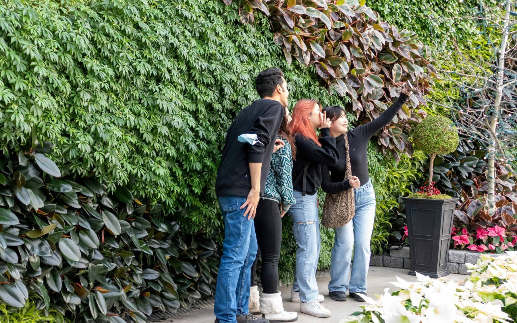 The popular houseplants used to create the green wall at The Leaf make an ideal photo op for these visitors from Japan.