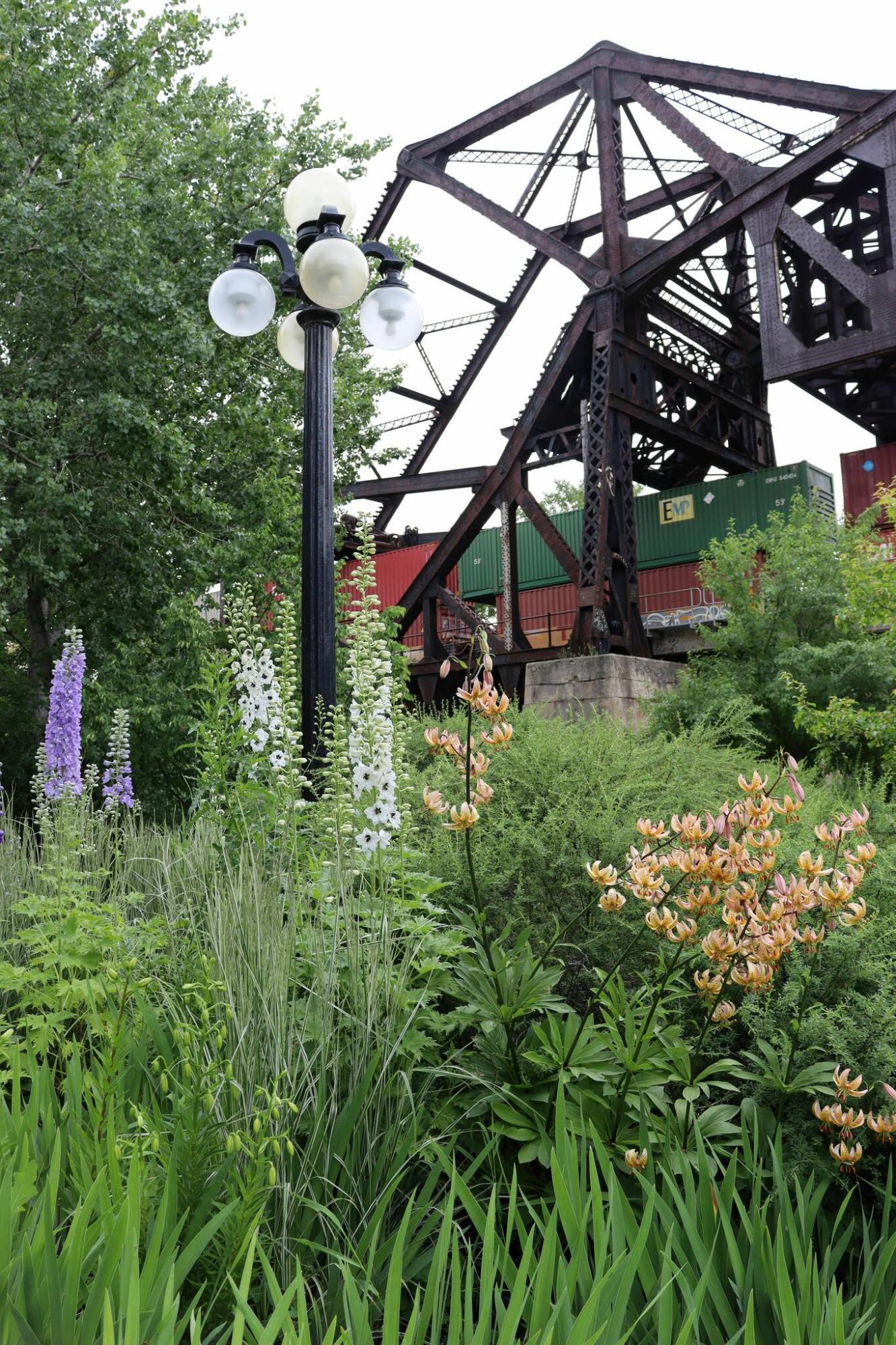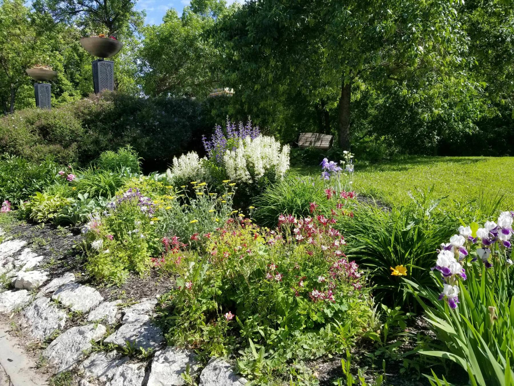 The roundabout at the intersection of Waterfront Drive and Bannatyne Avenue is an impressive focal point. At its heart stands the Selkirk Settlers 1813 monument, the work of sculptor Gerald Laing. The dense array of plants in the roundabout includes tall, purple-flowered alliums, Paeonia White Wings peony, Rose Glow Japanese barberry shrubs, breathtaking roses, aquamarine blue larkspur, a sweep of brilliant orange-flowered Maltese Cross, native grasses, and bronzy sedge grasses sprinkled here and there for textural contrast.