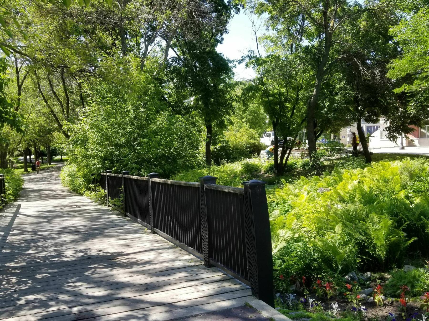 The patterning, created by laser cutting, mimics a fern leaf. The pedestrian boardwalk bridge, framed by mature trees and shrubbery, overlooks a fern-filled ravine dotted with the lacy, flat-topped flower clusters of Queen Anne’s Lace. Cyclists, couples who are strolling or walking their dogs, and mothers pushing strollers — all pause for a moment on the boardwalk to gaze at the natural beauty that is all around them before continuing on their path.