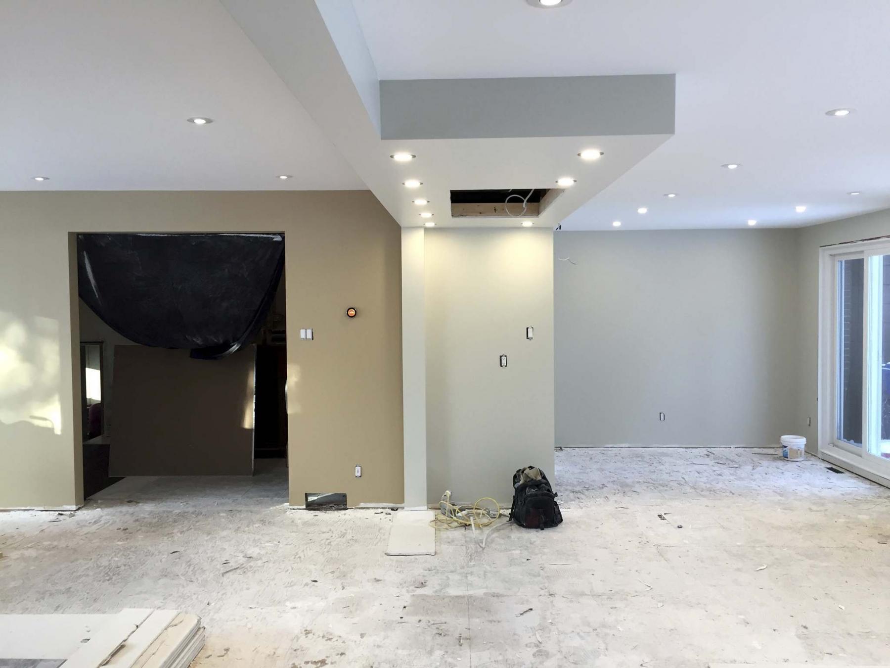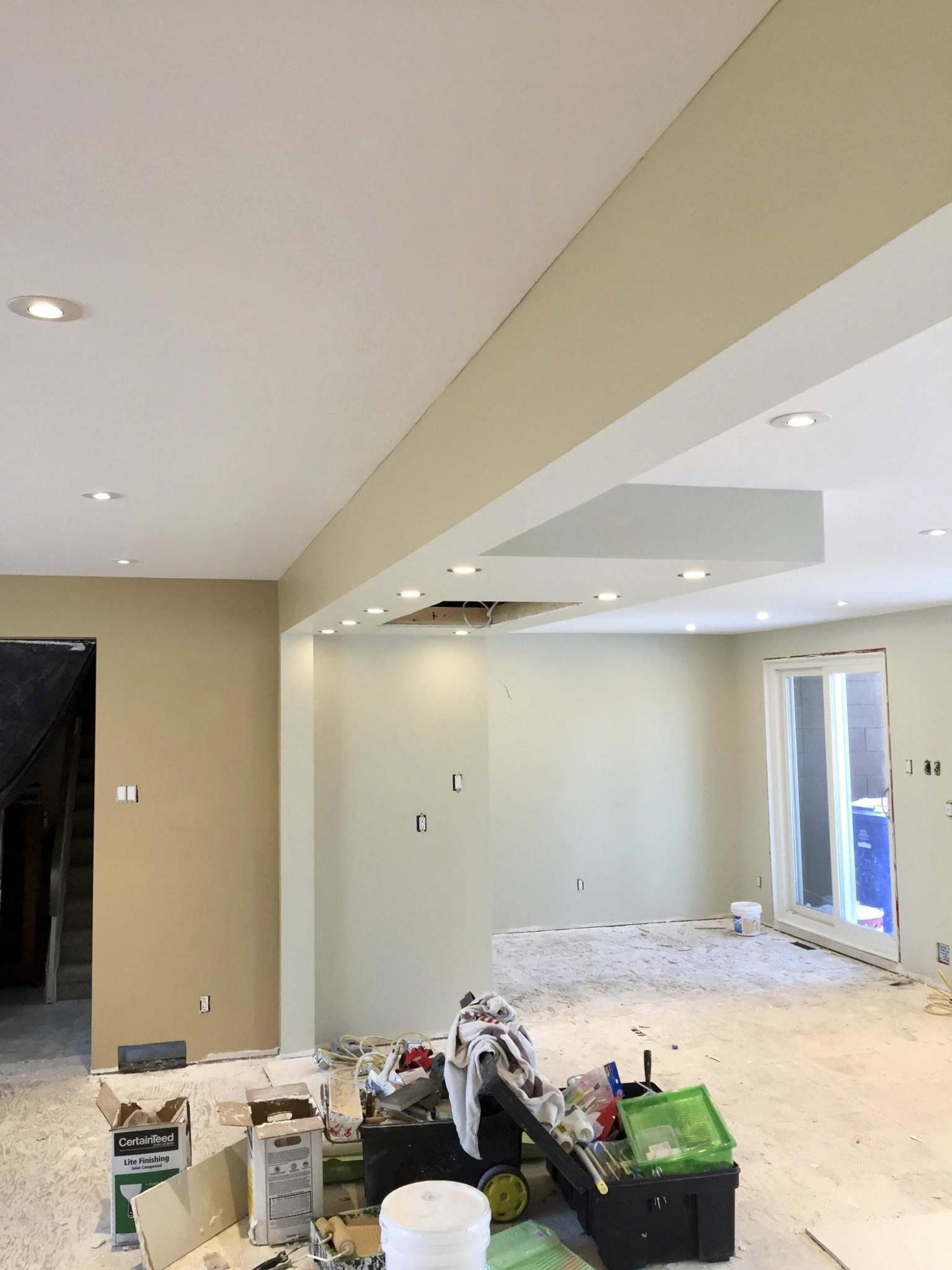 The ceilings were tackled first, while the boxing around the beam and island box-frame were last, after the wall were sheeted. The entire area was taped and mudded, using 90-degree cornerbead along every edge. After the fifth and final coat, the entire area was sanded and prepped for primer — the more than 1000 square-foot space started coming to life once everything was primed. Although the wall colour chosen for the front-side of the beam (living room) is slightly darker than the back-side (over-size kitchen), they compliment each other very well against the white ceilings.