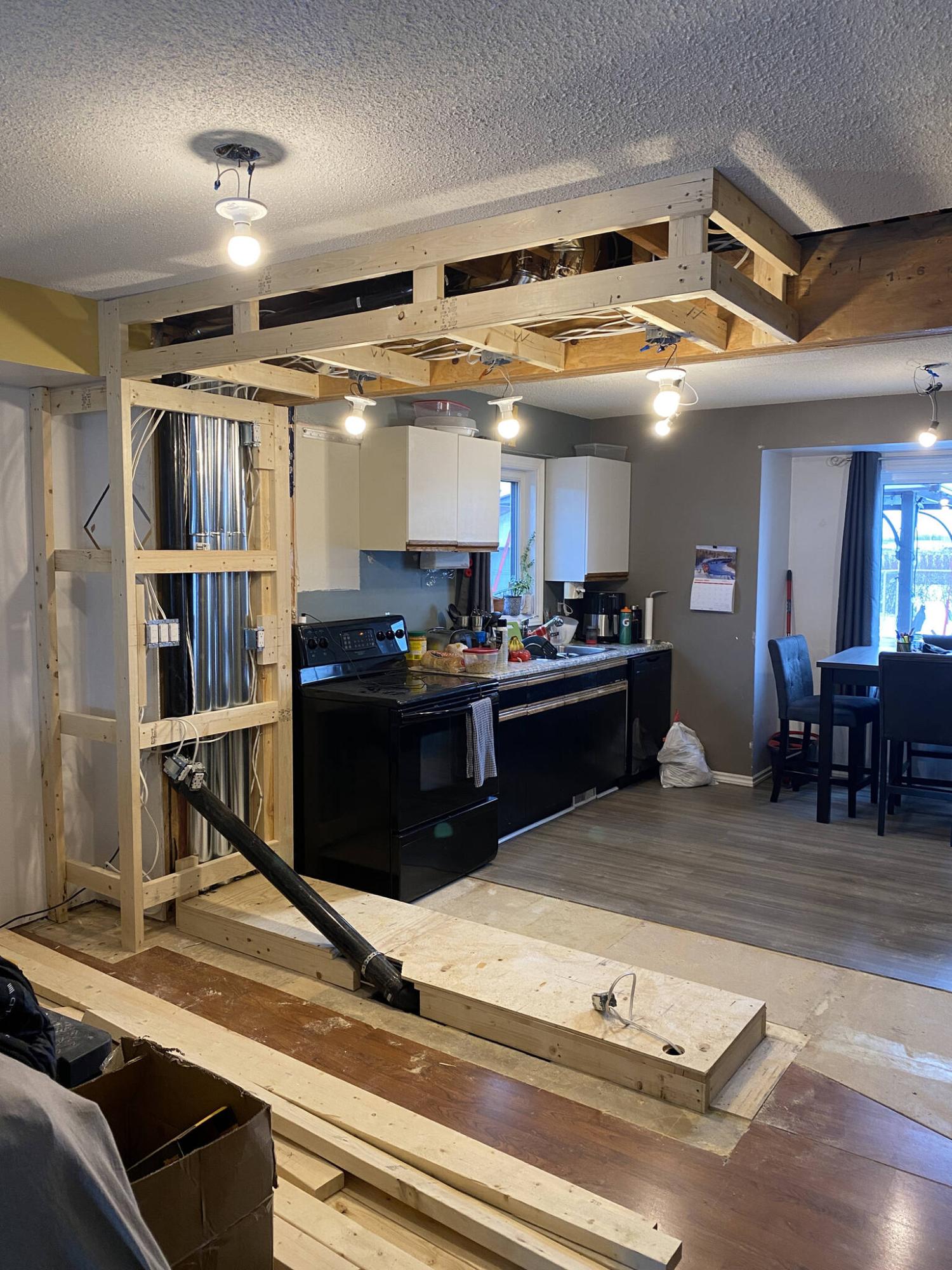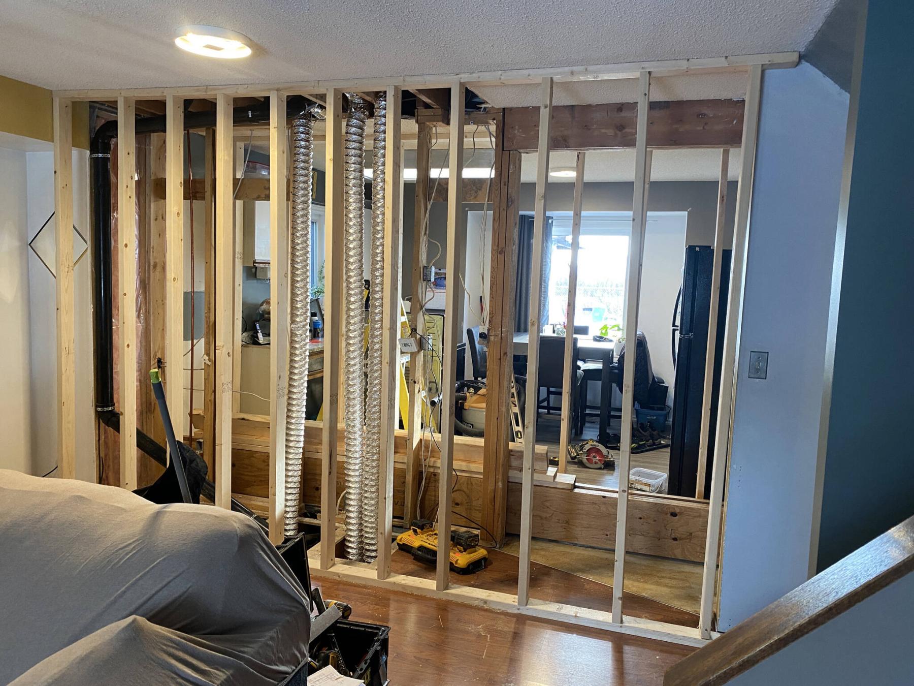 Before the old load-bearing wall was removed, temporary walls on either were build to share the load until the new beam was installed. (Marc LaBossiere / Winnipeg Free Press)
