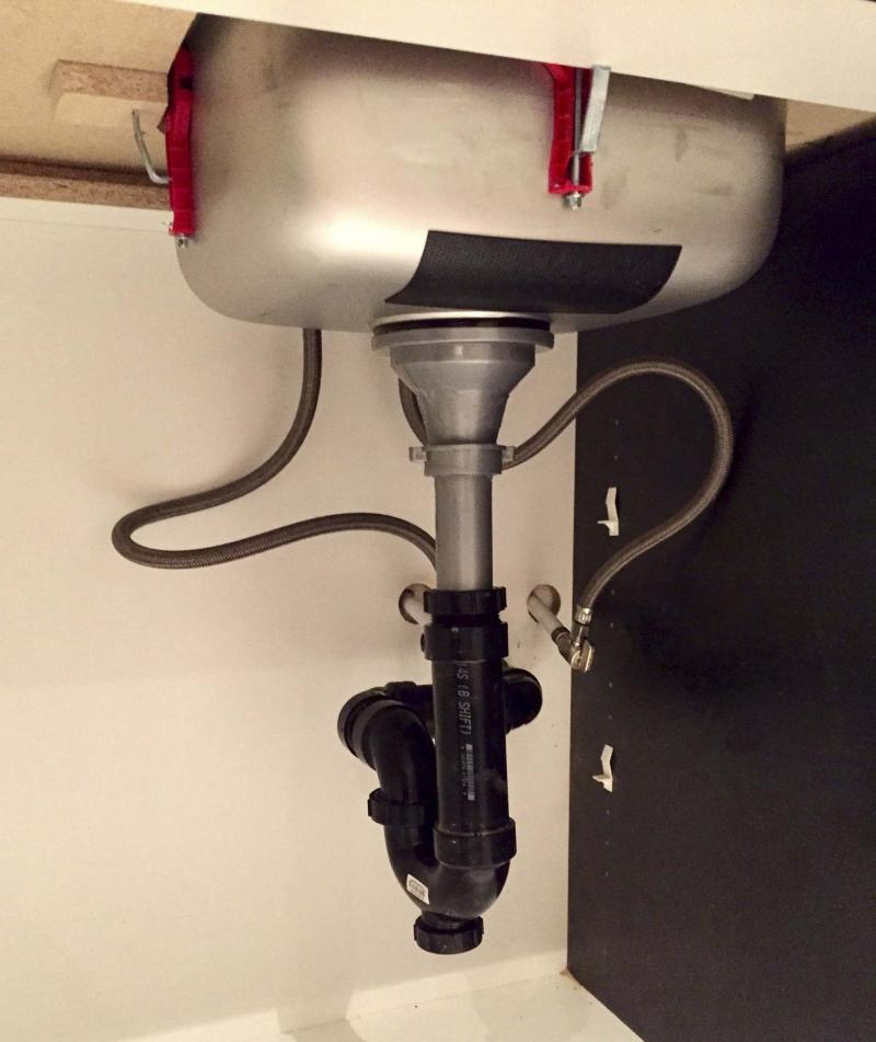 Don Kennedy’s lower level, below the counter the ABS trap, and mesh hoses attached to PEX shut-off valves for a bar sink installed atop an arbrite countertop.