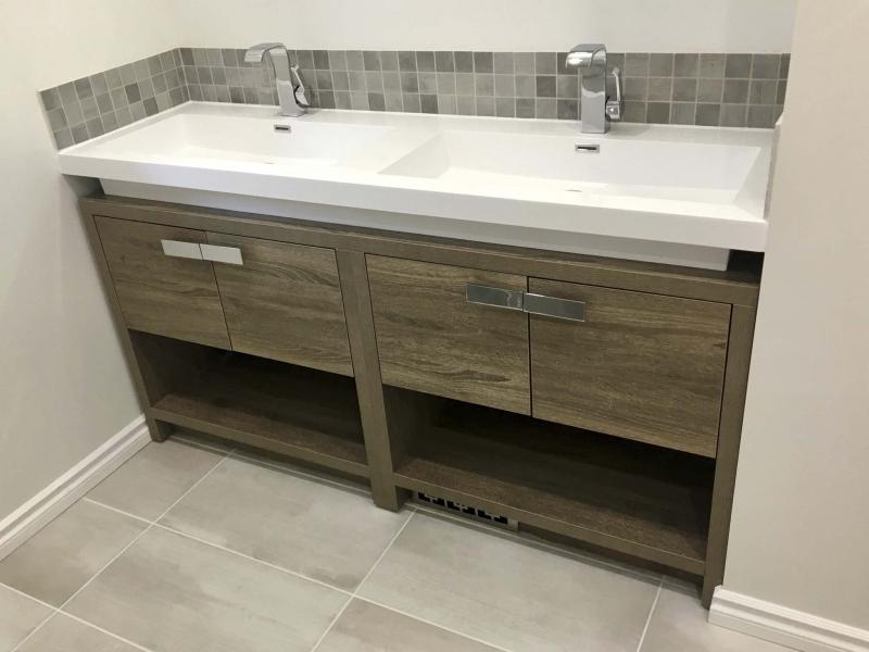Many times, I have been tasked with such a project. And more often than not, once the lower cabinet doors are opened to reveal the inner workings of an existing system, an unsightly mess is exposed. The drain and trap are crooked, the hot and cold water feeds are askew and off centre — it simply looks shoddy. During a full-out renovation of a bathroom, gutted down to the studs, it is easy to realign and centre the placement of drains and water feeds, based on the dimensions of the new vanity and sink. If, however, it is only the vanity that is being replaced, adapting to the existing drain and water feed locations is sometimes necessary. It is still very possible to clean things up down below.