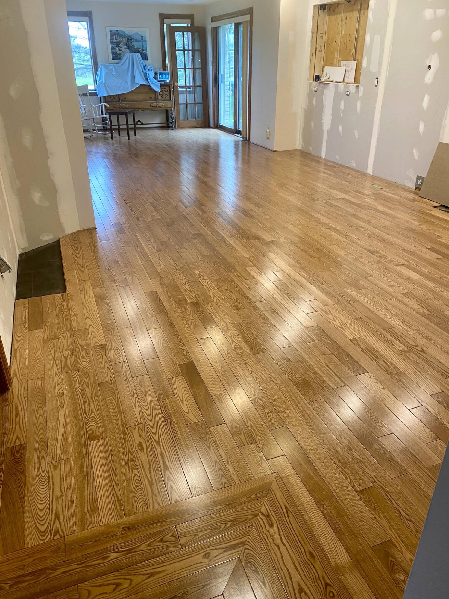 The blend of hardwood planks along the old wall area is virtually undetectable.