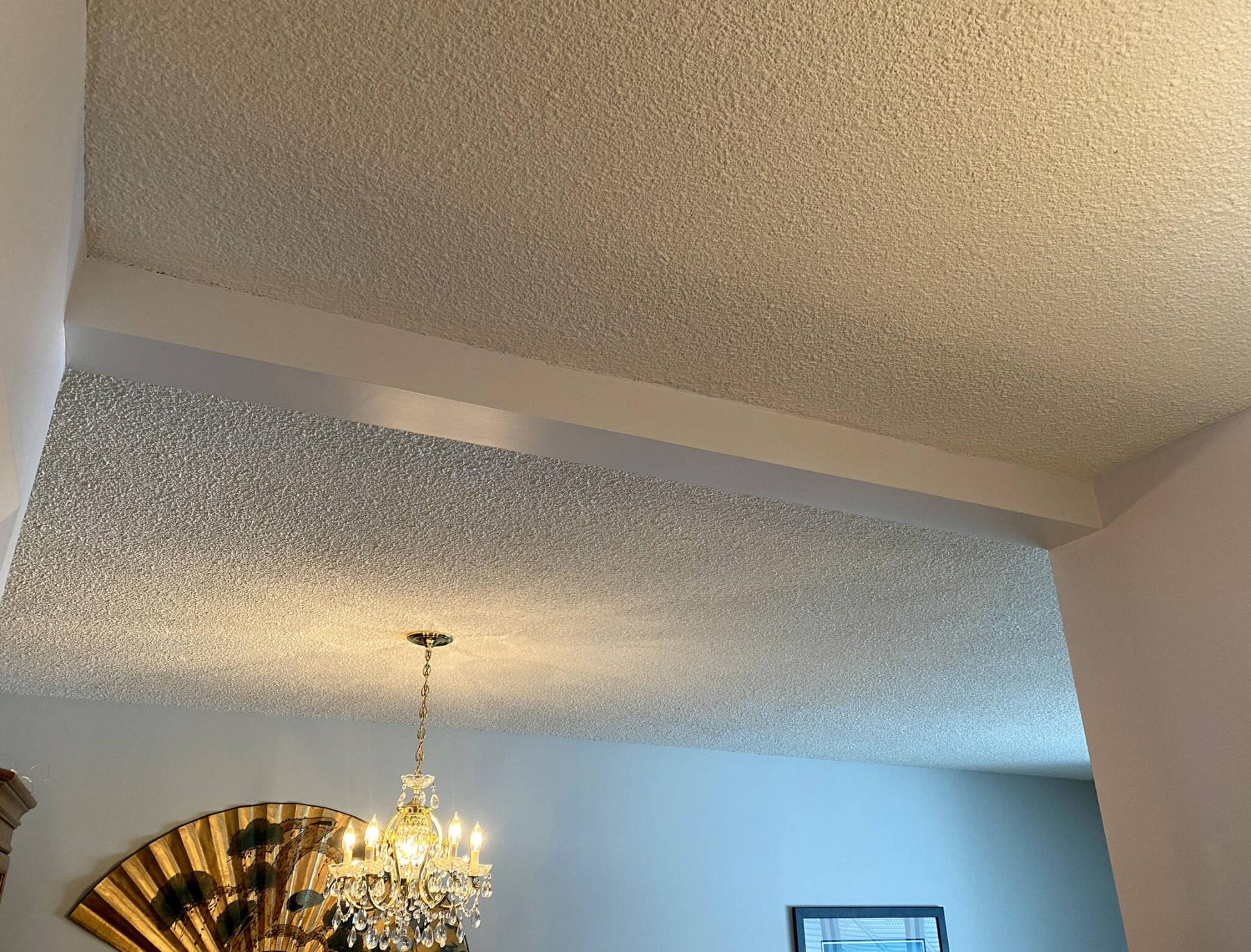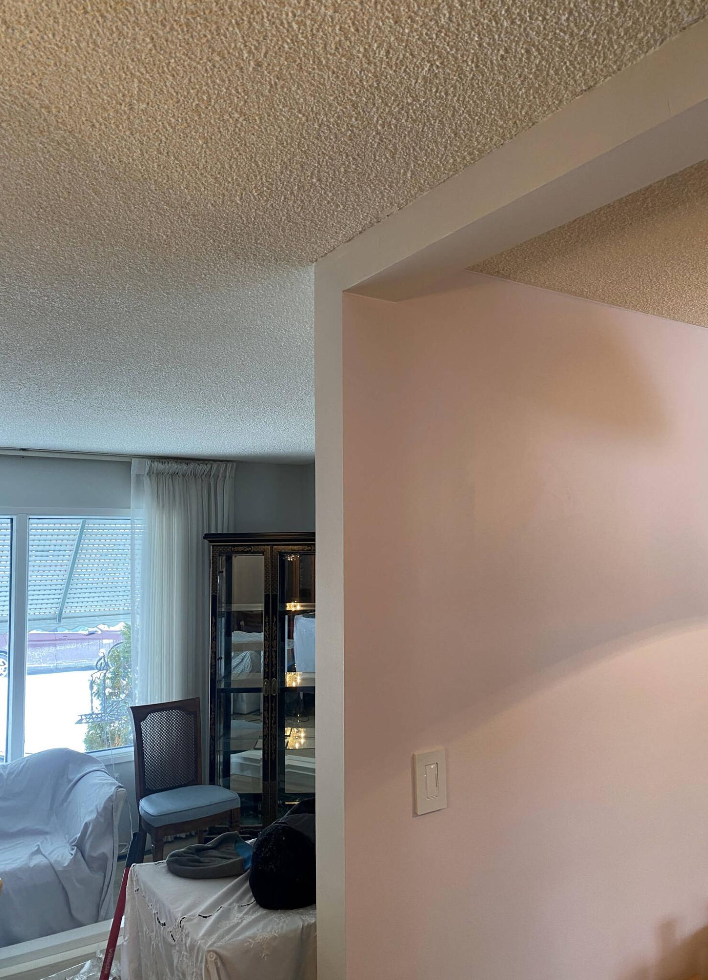 The ceilings, however, were mostly stippled. Much like trying to patch stucco on the exterior of a house, touching up stipple is nearly impossible. No matter how well the patching is done, in all likelihood the infill would remain visible.