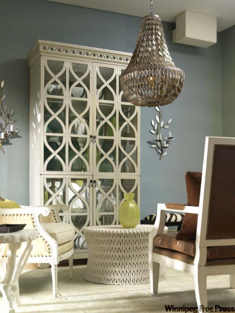If this look sparks your interest, you can update your home by an overall redo or simply by small changes and additions. How about combining this trend with eco-tecture and recycle a few pieces in your home with a coat of high-gloss lacquer paint? Breathe new life into your old dining set or dust off the old-style suitcases and stack to make a table. Then add some sparkle and dimension, with mirror wall scones and a pierced resin cocktail table.