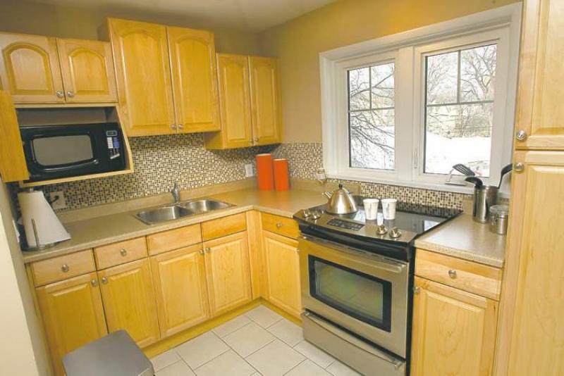 The suite's key spaces were also upgraded. The eat-in kitchen was outfitted (again in 2007) with natural maple cabinets with pantry, beige tile flooring, light-brown laminate countertops, a double sink, track lighting and stainless-steel Kenmore appliances, including a bottom-loading fridge and flat-top stove. A big window on the rear wall also allows plenty of natural light inside.