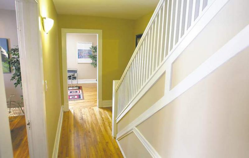 In the present configuration, the main level's front area is the living room, which is plenty big at five metres by 3.3 metres. Like every room in the suite, it has a large window to let in loads of natural light. Unlike the kitchen and bathroom, however, it has refinished fir hardwoods, which, along with 15-cm baseboards, adds yesteryear character to the unit.