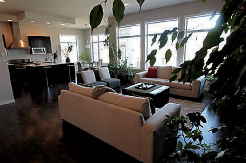 What lies behind is a bright (yet warm) open-concept great room area that's steeped in space and style -- and is subtly segmented into three distinct spaces. The warmth is derived from dark, engineered espresso maple hardwoods that run through the entire area, as well as smart charcoal maple cabinetry. The dark hues are then offset by beige quartz countertops, a textured beige backsplash and light earth-tone colours.