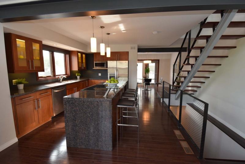 An exterior clad with modern-looking hardiboard and aluminum siding gives way to a bright, airy interior that features a well-coordinated collection of warm finishes: engineered solid oak cappuccino hardwoods, cinnamon-tinted maple cabinetry, black granite countertops and faux wood window casings.