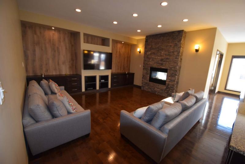 The home’s spectacular, yet sensible design continues in the great room, which is broken up neatly (and stylishly into four spaces: kitchen, family room, dining area and four-season sunroom. "I would call this area the showpiece of the home. The family room is a light-filled space that features a custom entertainment unit with espresso cabinetry and wood grain feature walls either side of the TV niche, as well as a two-sided cultured stone fireplace on its right-hand wall. Beautiful (cappuccino) maple hardwoods run through the entire great room."