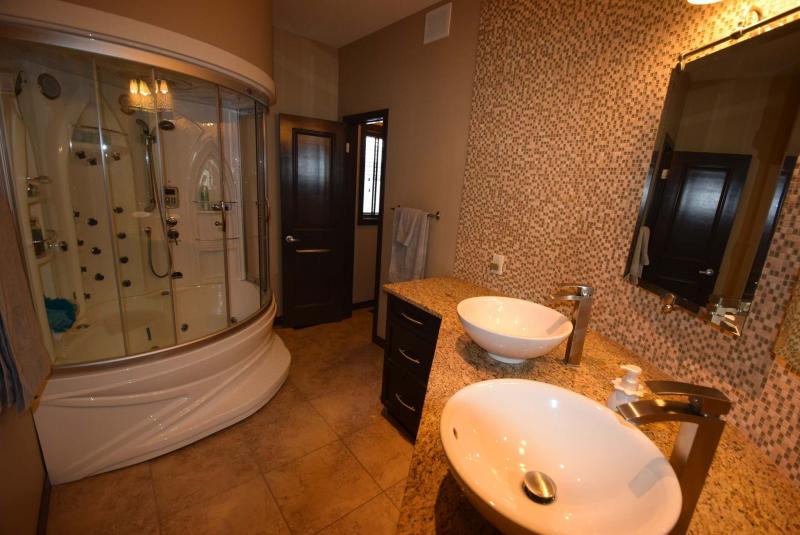 The bedroom is neatly separated from the ensuite by a deceptively big walk-in closet; on the other side of the closet is the opulent ensuite. "It’s an absolutely gorgeous space with heated (tan) tile floor, espresso walnut vanity with dual sinks, separate toilet area — and amazing curved steam shower/jetted soaker tub combination with multiple body sprays," Gulay says. "The shower unit also has a pair of speakers so you can listen to music while taking a shower or bath."