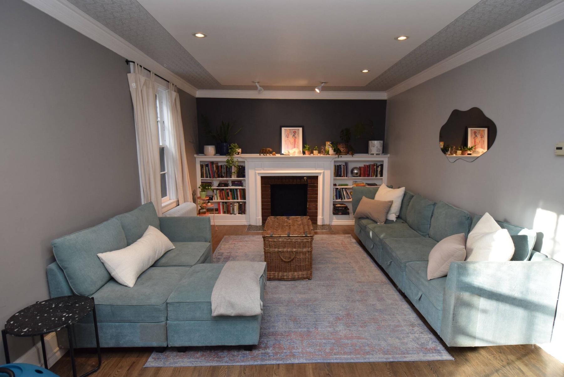 “I love the living room to the right — it mixes traditional and modern design themes beautifully with a grey-and-white ceiling with crown moulding and pot lights, and an ornamental brick fireplace with white trim and built-in bookshelves on either side.”