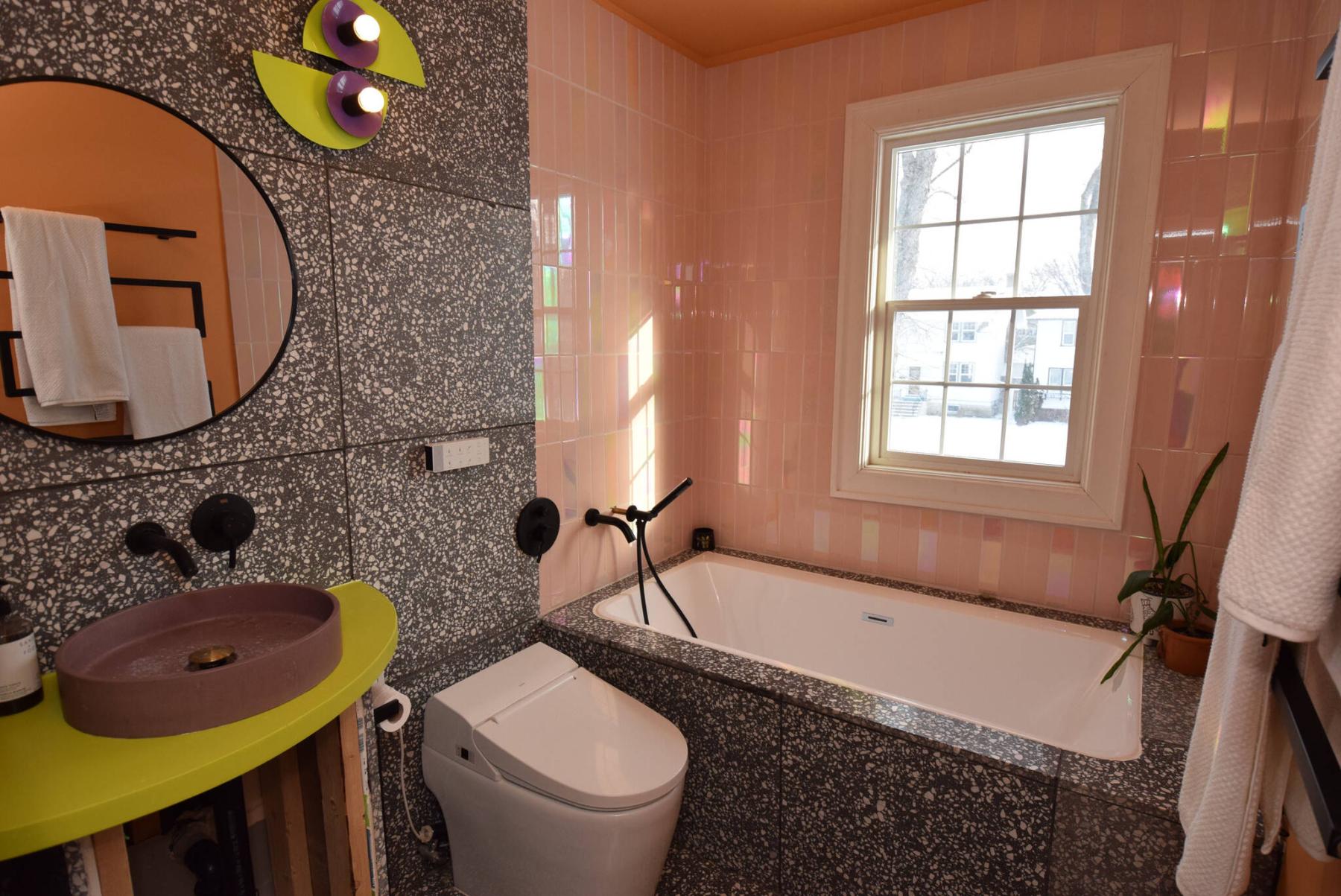 With its tiled walls and soaker tub with matching tile surround, the main bathroom is as luxurious as many ensuites.