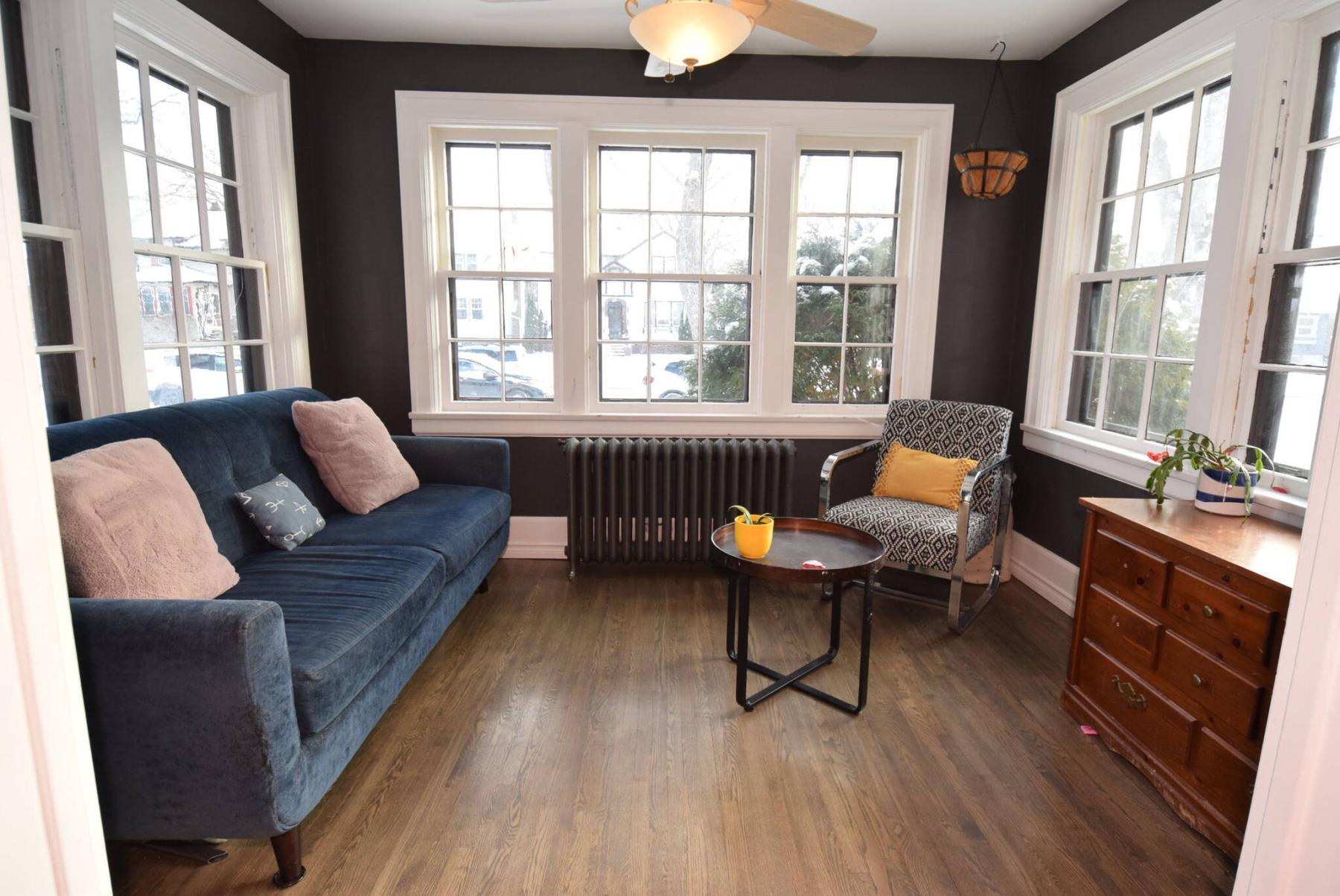 Surrounded by windows, the main floor sunroom — which could also be used as a den — is a lovely, light-filled space in which to sit down and read or enjoy a coffee.