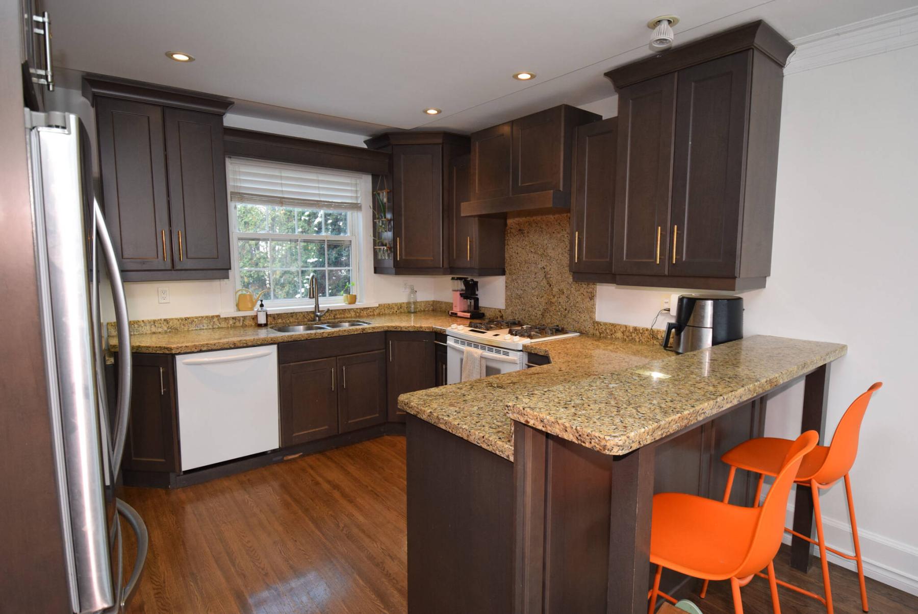 The remodelled kitchen comes with maple cabinets, granite countertops, a raised breakfast bar and new appliances that include a gas range.