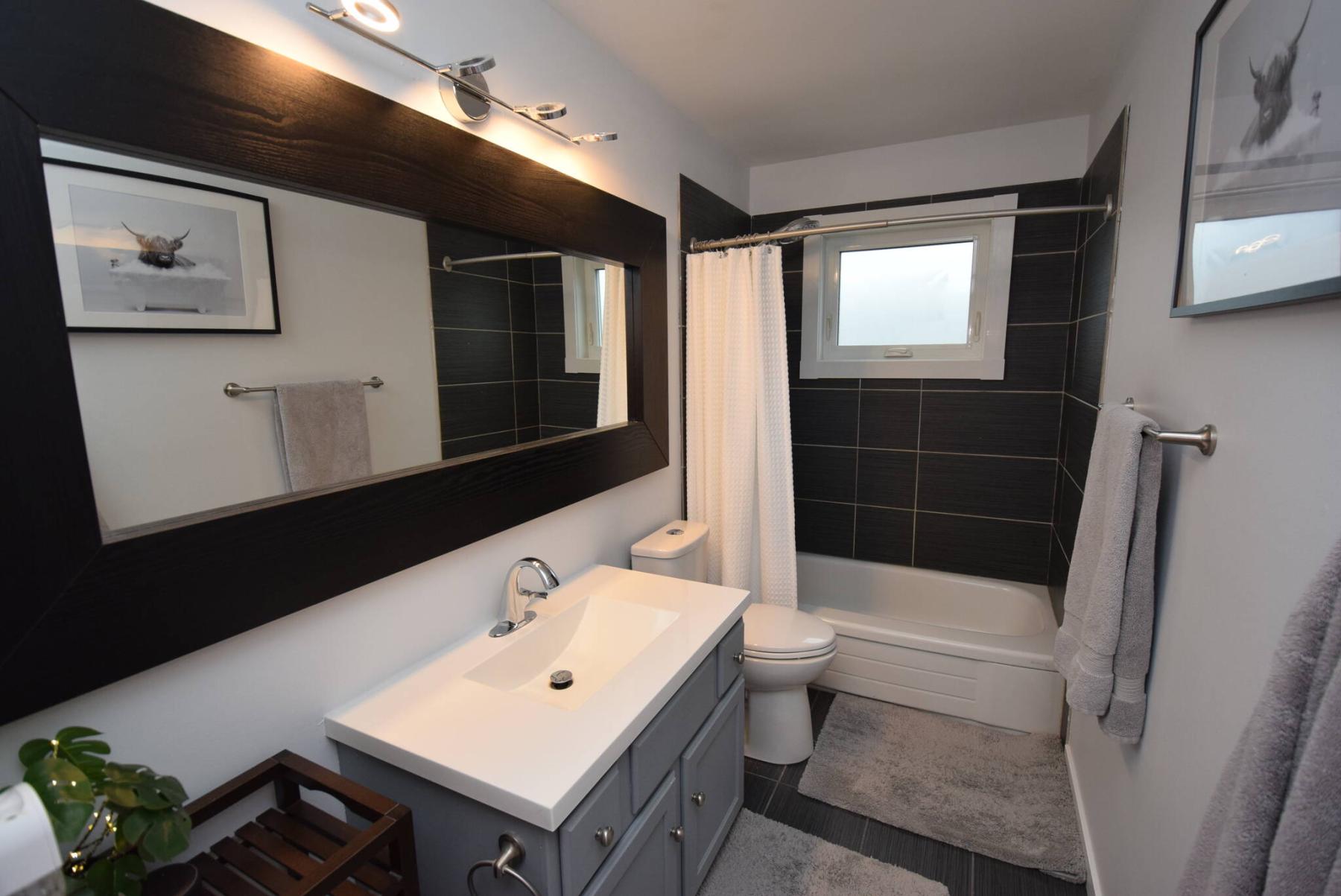 Ascend a brief set of stairs to the home’s upper level and you find two spaces: a masterfully remodelled main bath that offers a tile floor, tub with matching tile surround, contemporary grey vanity and a newer low-flush toilet.