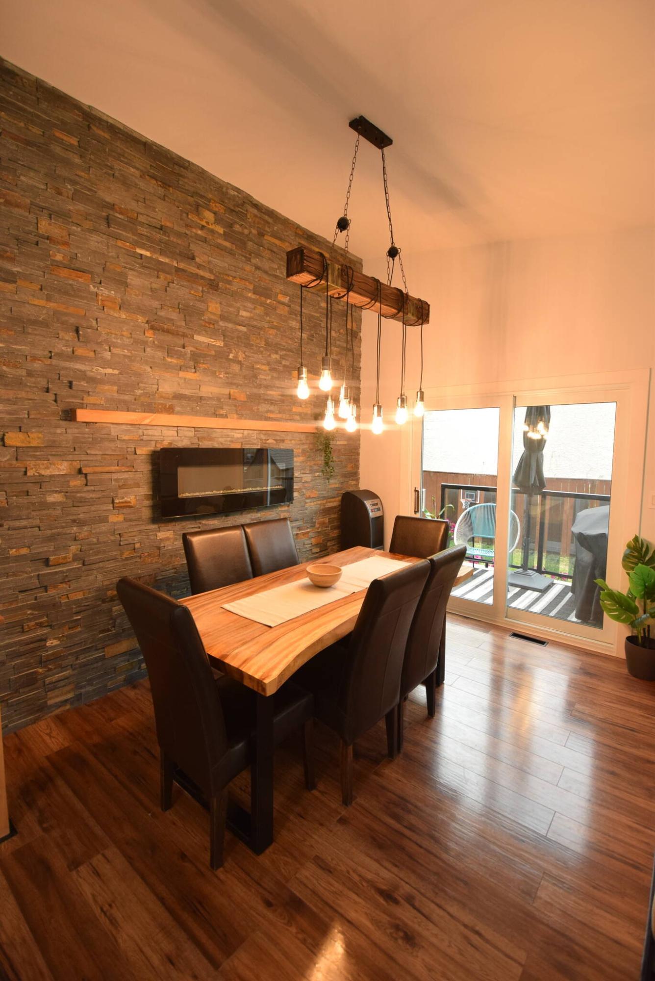 The dining area, which is next to a sliding patio door that leads out to an elevated barbecuing deck in the side yard, is framed perfectly by an elegant cultured stone feature wall.