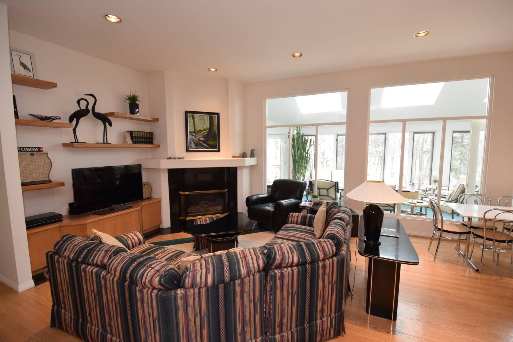 A cosy, welcoming space centred around a gas fireplace, the family room looks out onto a spectacular four-season sunroom.