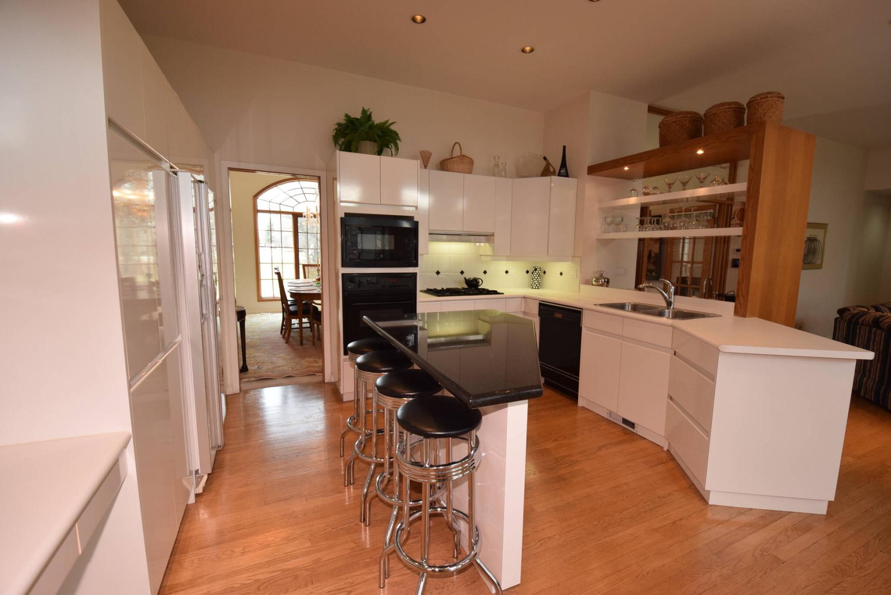 “The kitchen is a fabulous, functional space with an angled island that seats four, loads of contrasting white cabinets, a built-in oven and cooktop and tons of counter space. It opens perfectly onto a wonderful, inviting family room with a gas fireplace and spectacular view of the backyard through a huge window that looks out on to an amazing space behind it.”