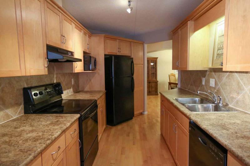 That functional style extends to the galley-style kitchen, which offers tons of natural maple cabinets, tan tile backsplash, newer taupe/tan laminate countertops, newer black Frigidaire appliances (fridge, stove, microwave, dishwasher) and a pantry that surrounds the fridge near the kitchen's four-foot-wide, angled entrance.