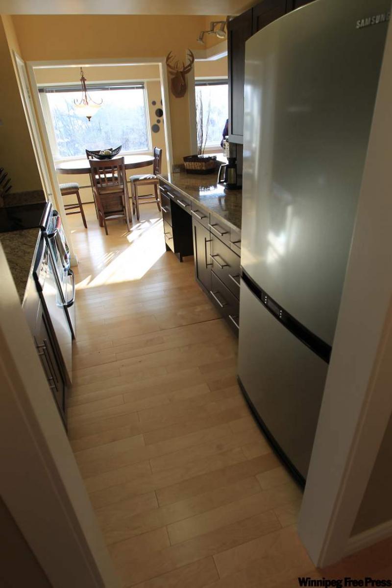 "The dining area (placed by a large window) is a nice size, and the galley-style kitchen offers a cutout that not only opens it up to the living room, but also contains an eating nook for two," Wiebe says. "It's also been nicely upgraded with (tan with black accents) granite countertops, espresso maple cabinets and stainless-steel appliances. There's also a handy pantry, too. If you like to entertain, you can do it easily."