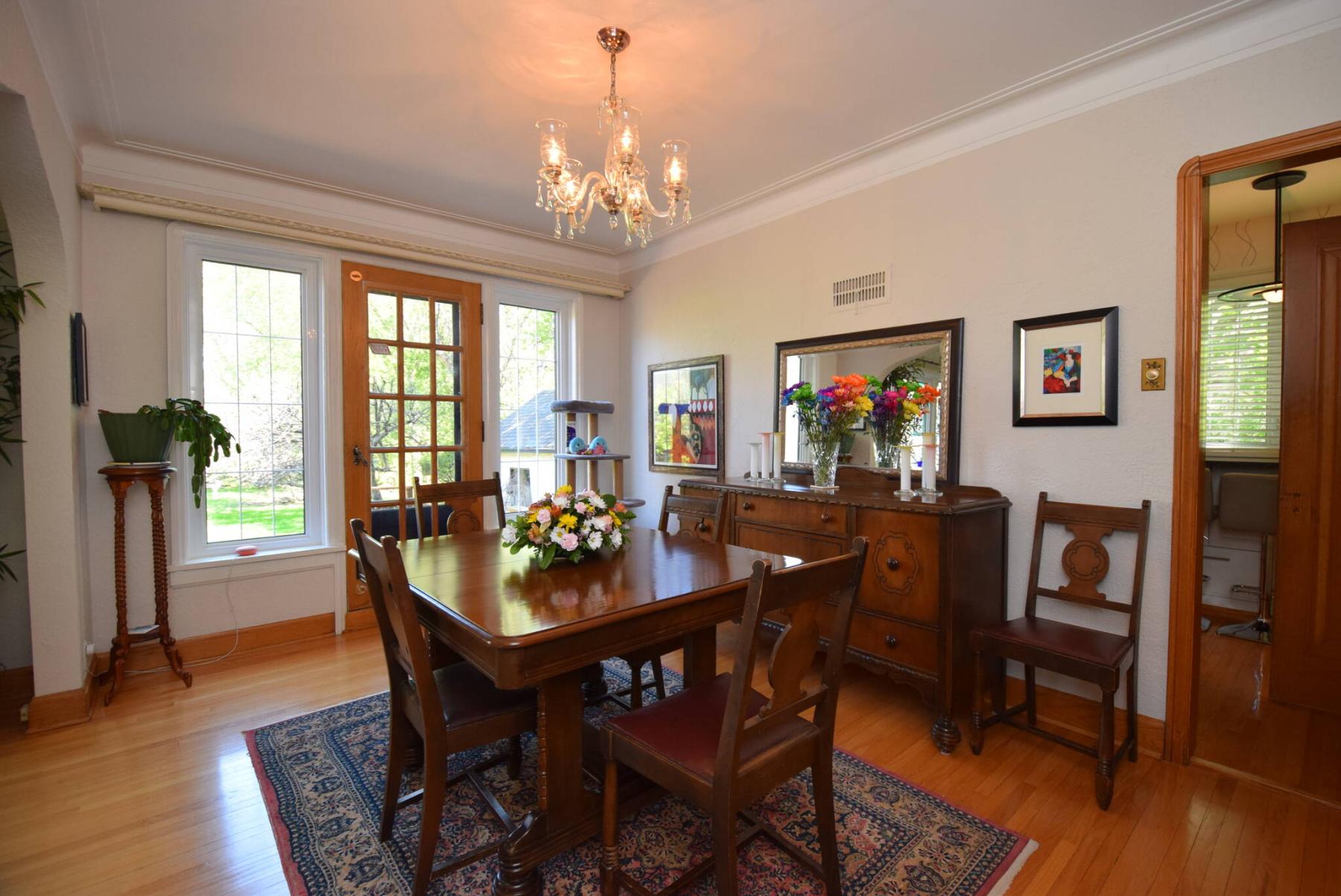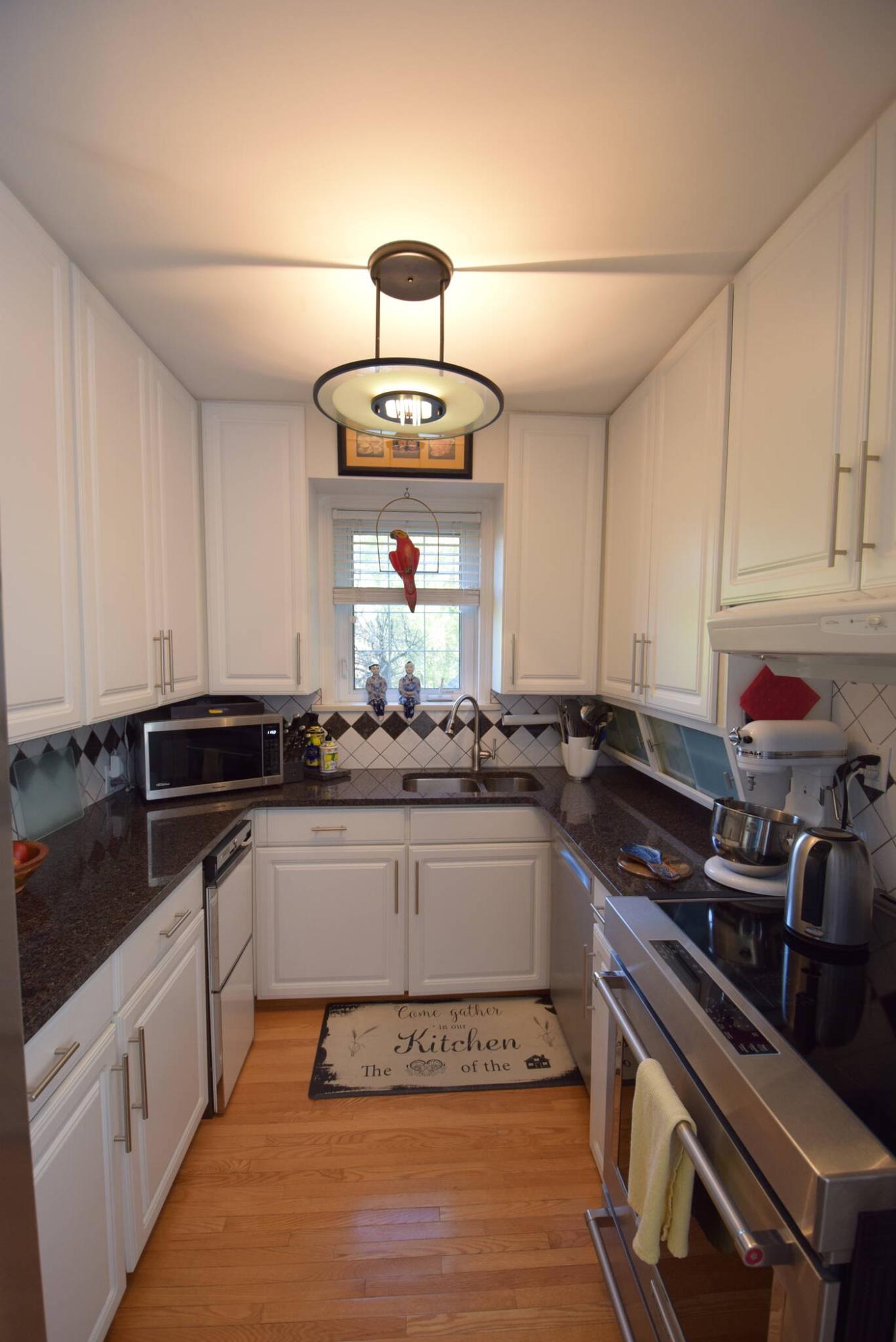 “Kitchens in many older homes aren’t always that functional. That’s not the case here. There’s an eating nook for two next to a large window, and the u-shaped kitchen has been updated with lots of white cabinets, granite countertops, a tile backsplash, newer stainless appliances, and contemporary lighting.”