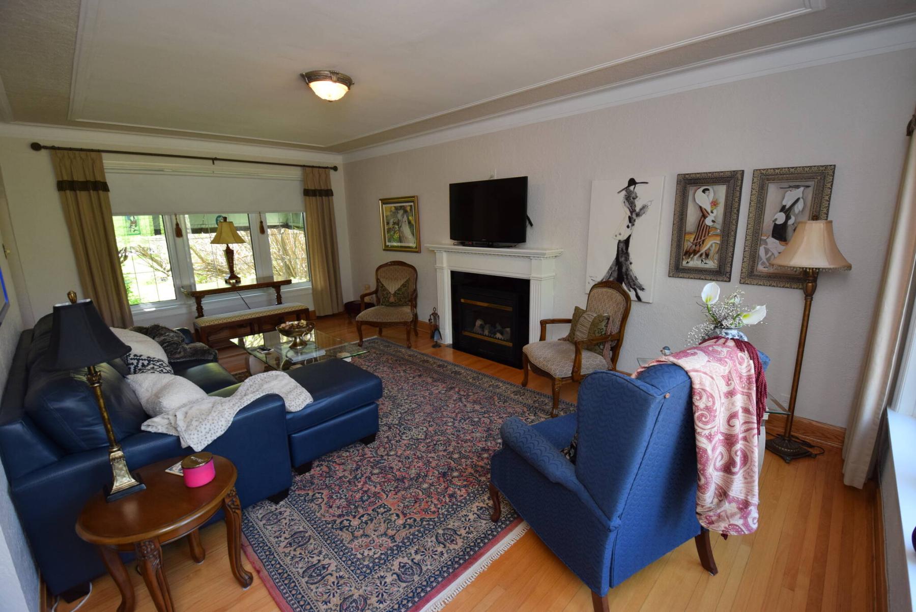 “I just love it,” he says. “A gas fireplace at its center is its focal point, while huge windows on the front and back walls let in all kinds of natural light, and look out onto the mature trees in front, and the backyard and river behind. Other details, like the original hardwoods, high baseboards and two-tone ceiling with its molding details give it even more character.”