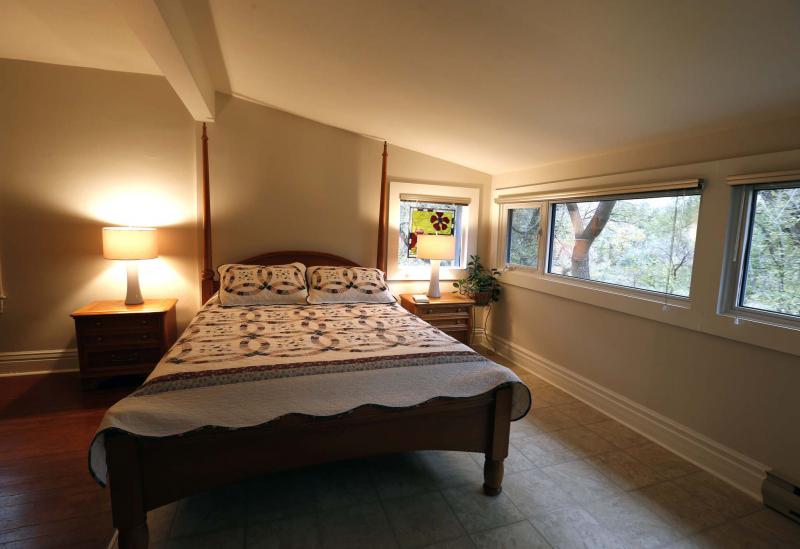 Turns out, the master suite is filled with an assortment of contemporary surprises. "It’s a huge space with vaulted ceiling (20.3 feet by 10.8 feet) that features an elevated river/tree view through four big windows on its rear wall, as well as a walk-in closet, sitting area and extra closet off the sitting area. The tree-level view is spectacular — you feel like you’re in a tree house that overlooking the river."