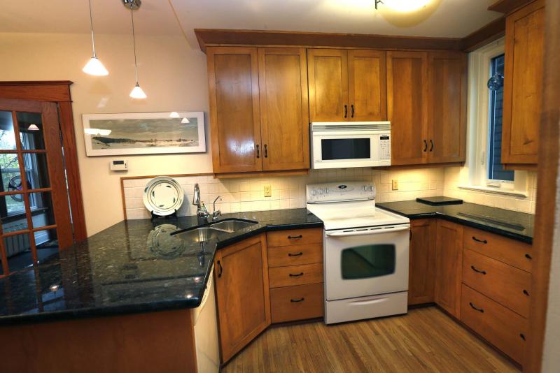 The updated kitchen features granite countertops, cottonwood cabinets and a U-shaped interior that promotes a smooth flow.