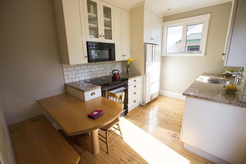 Turns out, the kitchen benefits in a big way from that exposure. Sun streams in through a huge window over the sink, bathing the remodelled space in invigorating morning sunlight. "The kitchen was recently updated with new (white) cabinets, granite countertops, tile backsplash, a host of pot lights above, plus a built-in breakfast nook," said Neumann. "There’s also plenty of room to move around, which isn’t always the case in kitchens in homes this old. The original maple flooring is a nice touch that speaks to the home’s turn-of-the-century origins."