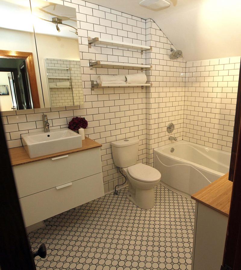"It features an octagonal tan/grey tile floor, floating vanity and storage unit with bamboo countertops and soaker tub (with rain shower head) set in a white tile surround that extends to the walls beside it. Like the kitchen, Stefan wanted to do something special with it. Not only was care put into the renovations — Stefan says he rehabbed the home — but artistry was put into the renovations, too."