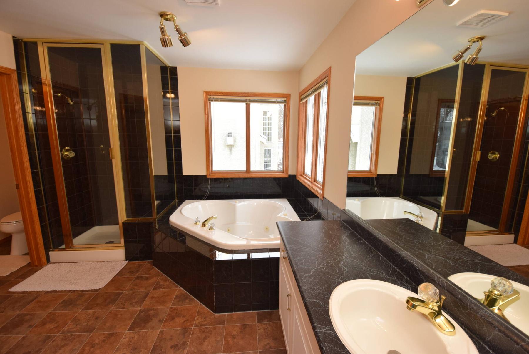 The spa-like ensuite is centred around a corner jetted soaker tub and gorgeous steam shower with gold trim and black tile surround.