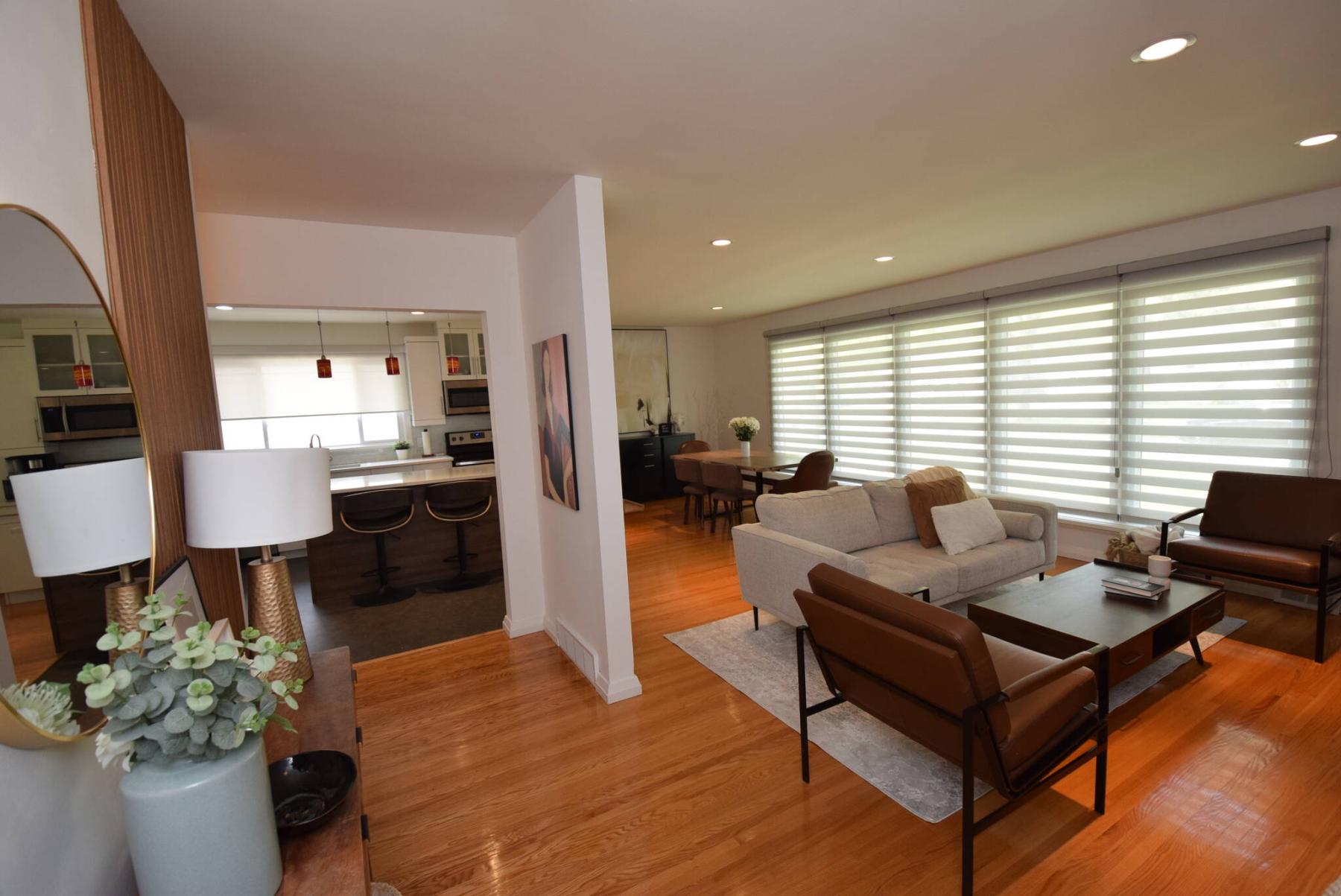 Meanwhile, a wing to the left of the marvelously modern kitchen holds four spaces: an updated four-piece bath and three good-sized bedrooms.