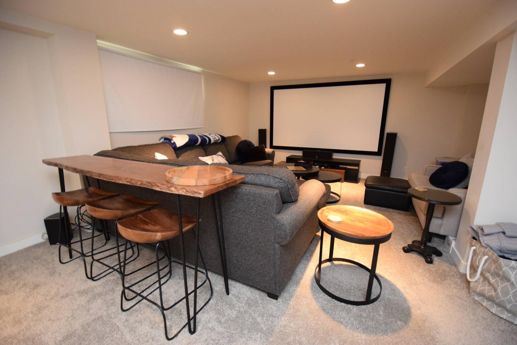 “Its main attraction is a fabulous media room. There’s lots of seating, and a huge screen to project movies and sports events on, just for your enjoyment or the enjoyment of you and your friends. There’s also an office space, office space, updated three-piece bath and flex space that could be used as a bedroom if its window were enlarged to meet legal egress standards.”