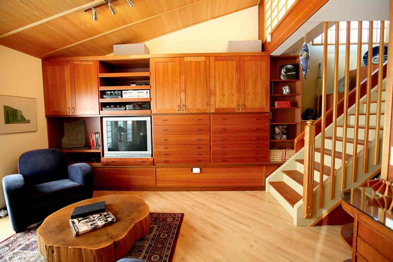While all the woodwork is impressive in its warmth and texture, it's set off all the more by the fact natural light filters softly into the great room through a design feature that's thoroughly -- and wonderfully -- Japanese in its derivation. "The home's south wall is filled with two patio doors with shoji screens that diffuse all the natural light that hits the rear of the home," said Kehler. "The screens do a great job of providing privacy, and allowing just enough light to create a bright, yet welcoming feel. And the entertainment unit is not only beautiful, but efficient with all the storage space its drawers and cabinets offer."