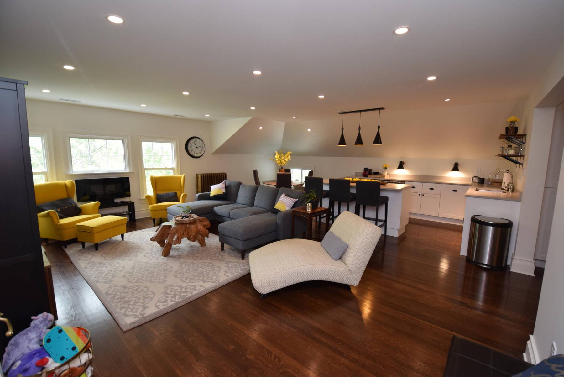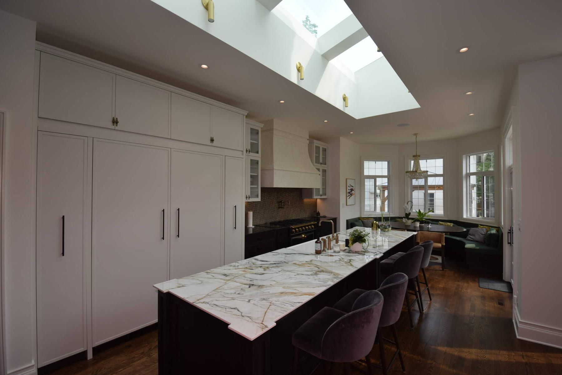 “Previously, the area was used as a summer eating area,” she says. “The island kitchen is a chef’s dream complete with a butler’s pantry, high-end appliances, skylight, and gorgeous finishes such as a custom plaster hood fan, gold backsplash tiling and spectacular quartz countertops. There’s also a wonderful banquette eating area to the rear.”