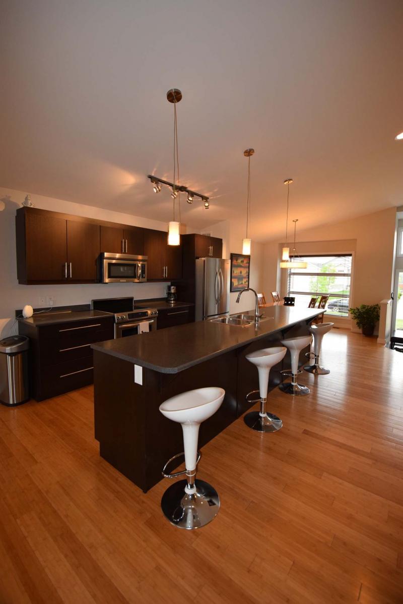 "There’s an oversized window next to the dinette at the front of the home, and the family room also has a big window on its rear wall," Kuppers said. "The front door (with a glass centre, sidelights and transom window overhead) lets more light in from the front, while a patio door at the rear of the living room also lets in more light. Finishes like Soho (walnut) thermofoil cabinets add warmth along with the bamboo floors."