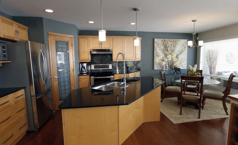 Finishes, meanwhile, offer a contrast of colours that suits the space perfectly: natural maple cabinets (and tons of them), black granite countertops, a blue/grey (diamond-shaped) tile backsplash and cappuccino-stained oak hardwoods.