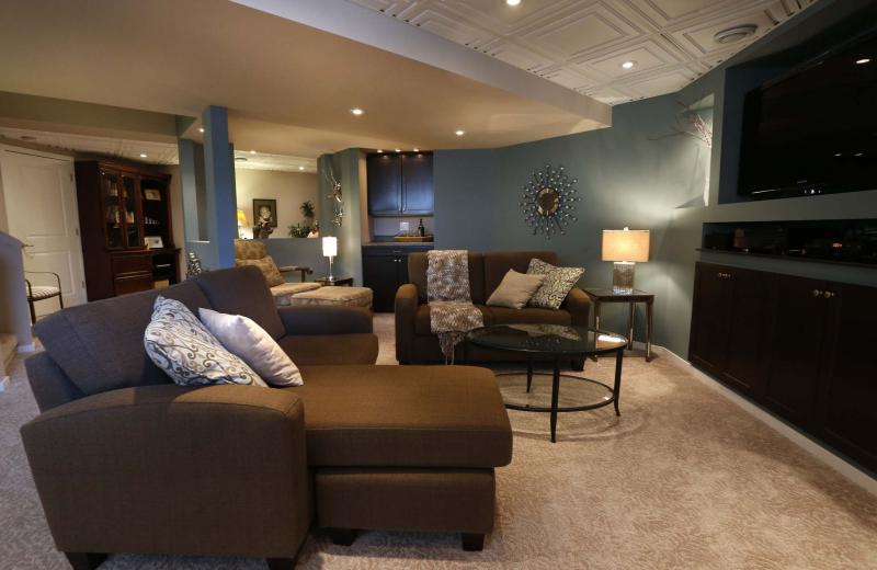 The basement has a surprising number of functions, including a media room, office space, exercise room and storage.