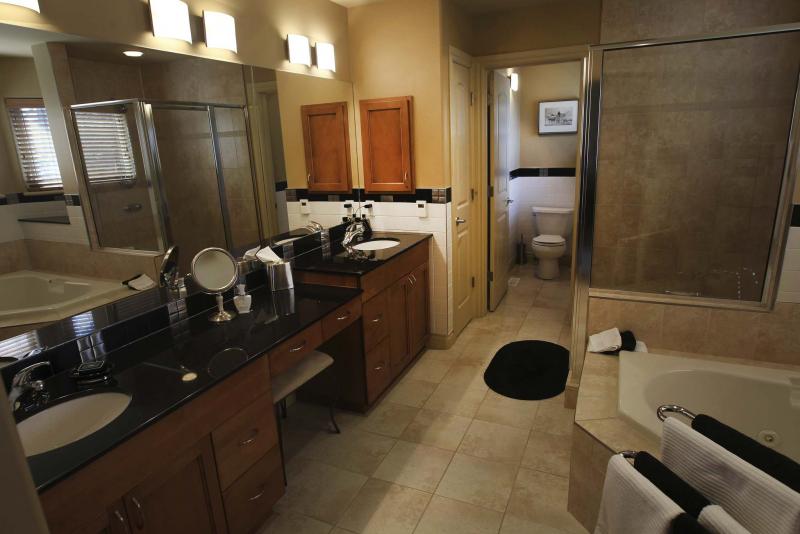 The ensuite off the master bedroom with dual sinks, a glass shower and jet tub.